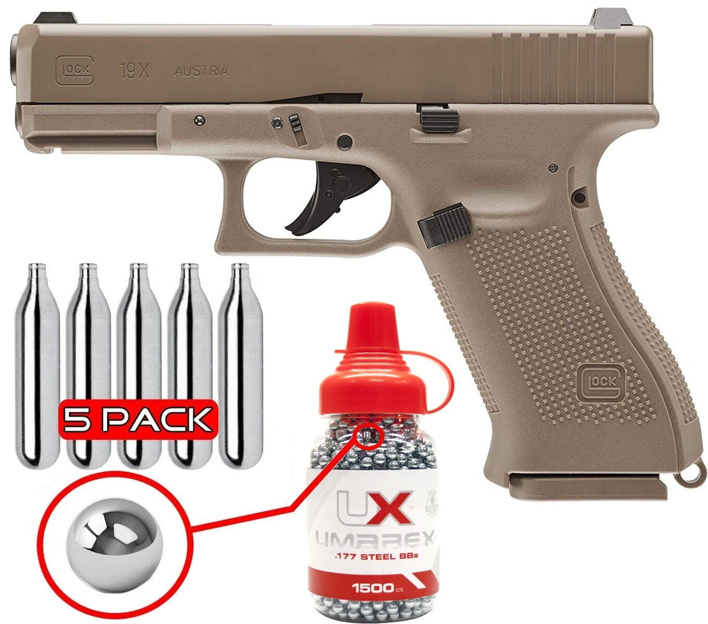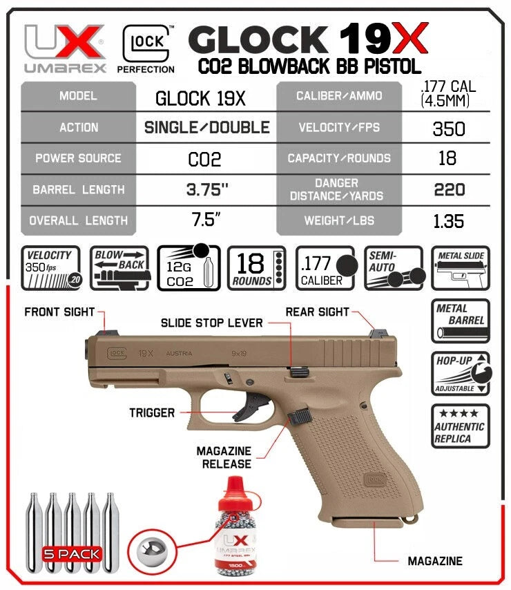 GLOCK describes the G19X as its first “crossover pistol”. It combines the full-sized frame of the G17 with the compact slide of the G19. The special color, Coyote, sets this pistol apart from other models. This licensed CO2-powered airgun version from Umarex is an authentic replica with the exact dimensions and markings of the original. It fires 4.5-mm steel BBs with a maximum of 2 joules, and the blowback gives you a powerful recoil. The all-in-one magazine accommodates the cartridge plus 18 steel BBs. |