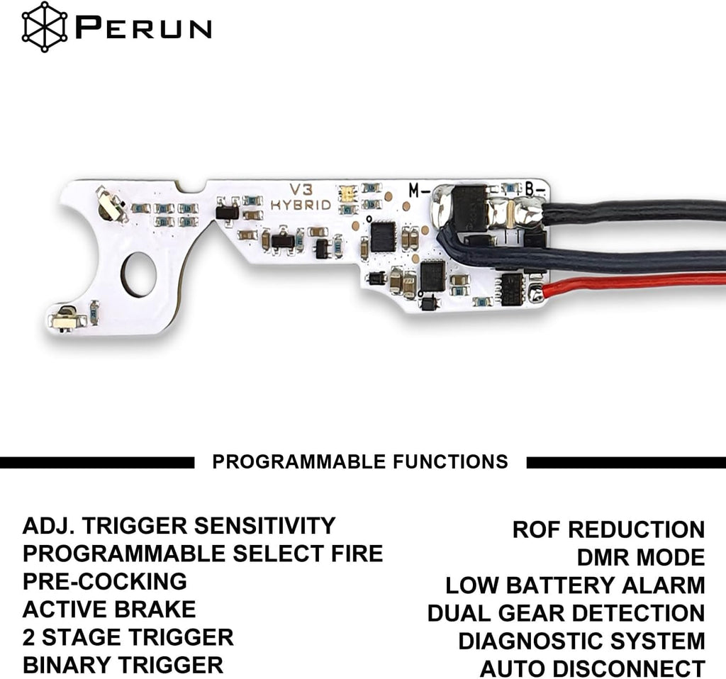 • Perun V3 Hybrid Mosfet replaces mechanical contacts in your airsoft AEG and provides lots of useful features; Works without the need for any modification with most V3 gearboxes in Tokyo Marui standard; Can be wired to Front or Rear with Included Deans Connector (Modifications may be required for non-standard V3 Gearbox, Please refer to Installation Guide)